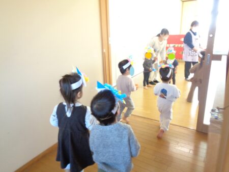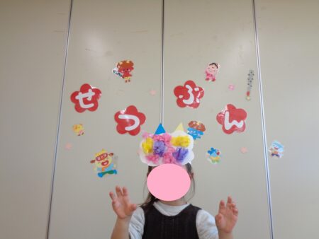 「鬼は~そと」「福は~うち」と豆まきの練習をしてきました