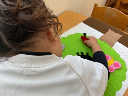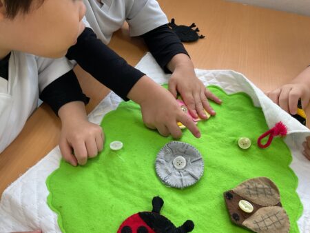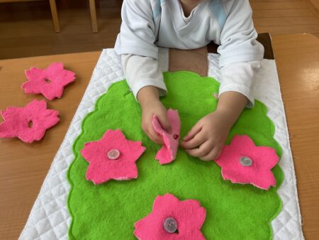 最初はボタンをボタンホールにぐっと押し付け、「せんせい、これどうやってやるん?」と保育士と一緒にやっていた子ども達でしたが、段々とコツを掴んできて、「みて!ぜんぶできたよ!」と誇らしそうな笑顔で完成したものを見せてくれるようになりました。
