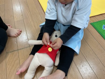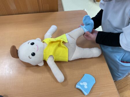 大好きな赤ちゃん人形のお着替えも、ボタン留めのものを用意しました。靴下も履かせて、「おでかけのじゅんびしてるねん」と嬉しそうです。