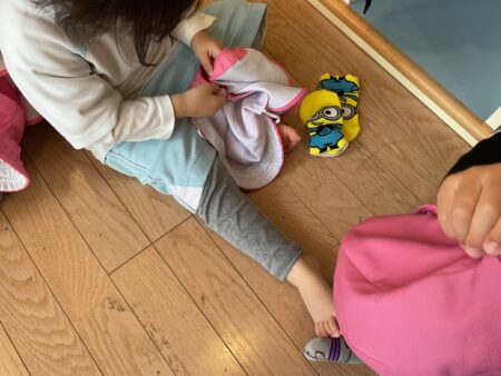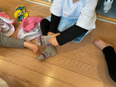 実際に戸外あそびに行く際には、自分で靴下を履こうとする姿があります。子ども達の「じぶんでやりたい!」という意欲を尊重し、自信をもって生活できるように日々の生活の中でサポートしていきたいと思います。