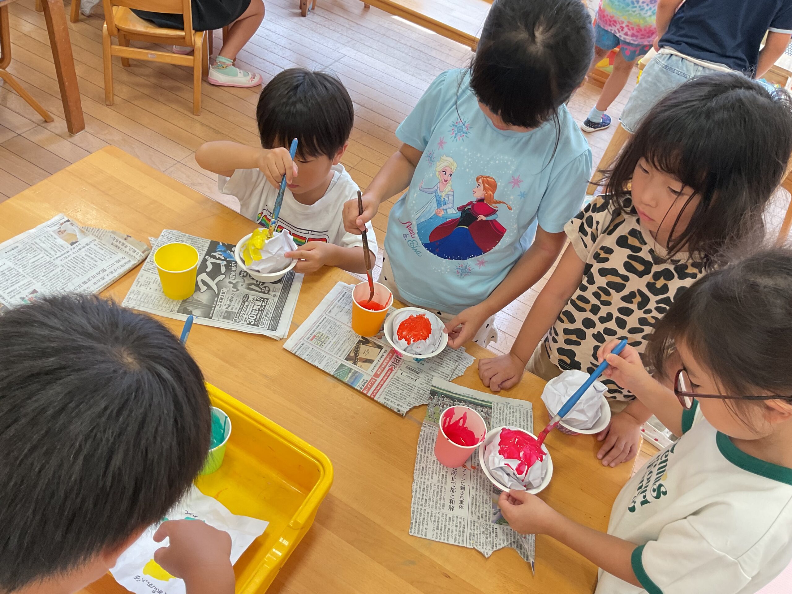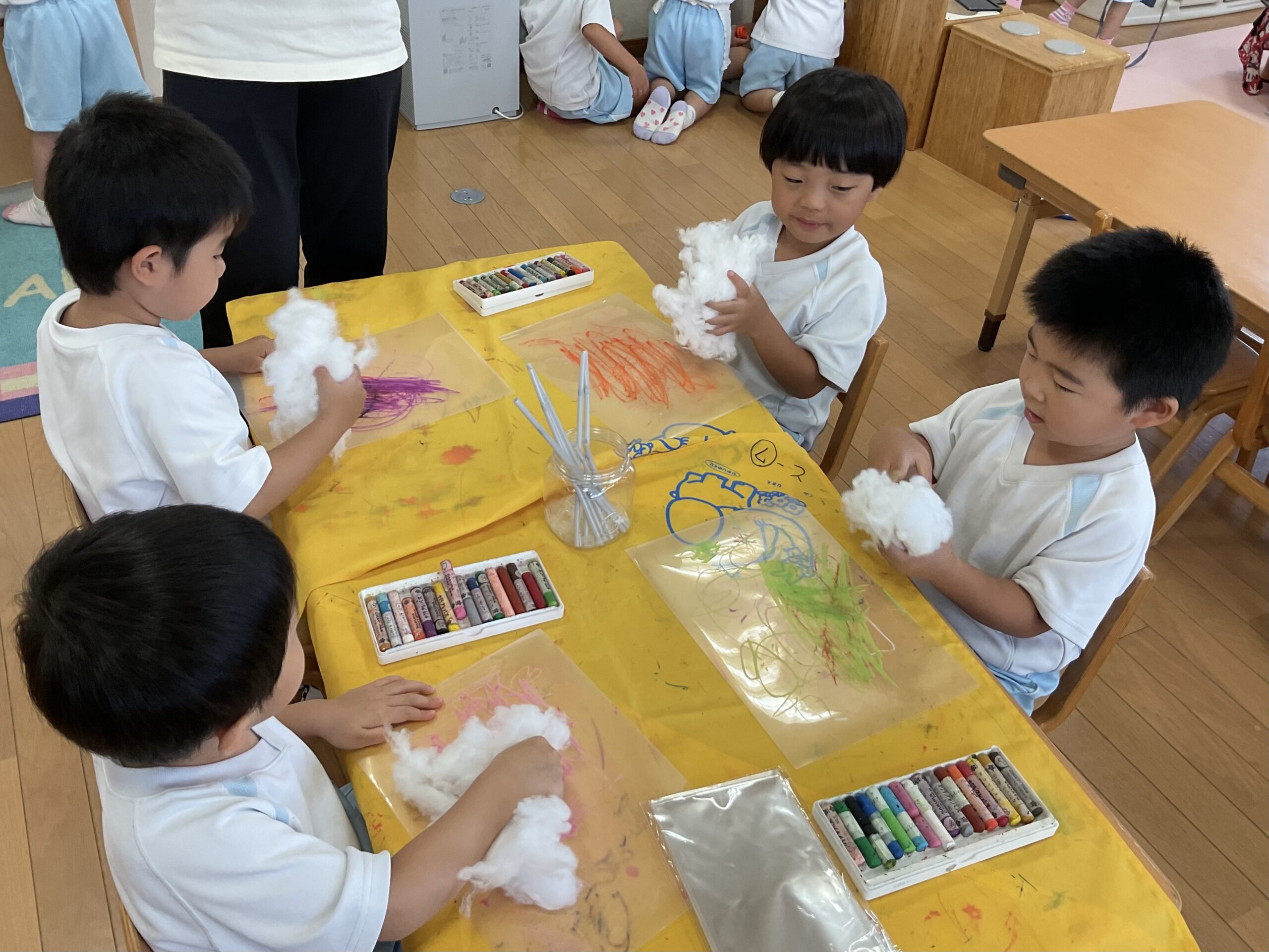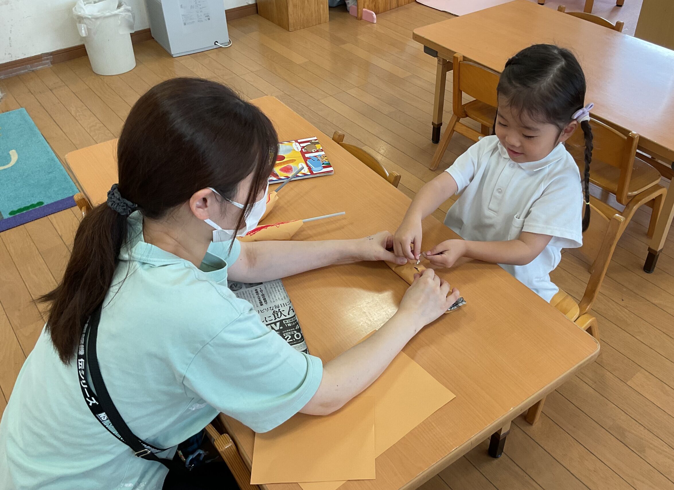 休日にそれぞれ楽しんだ思い出を話してくれる子どもたち。特に夏祭りに行った話が多く聞こえました。お祭りで食べたもの、遊んだゲームなど印象に残っていることを教えてくれ、その中で保育園でもお祭りをしたいとのリクエストがありました。