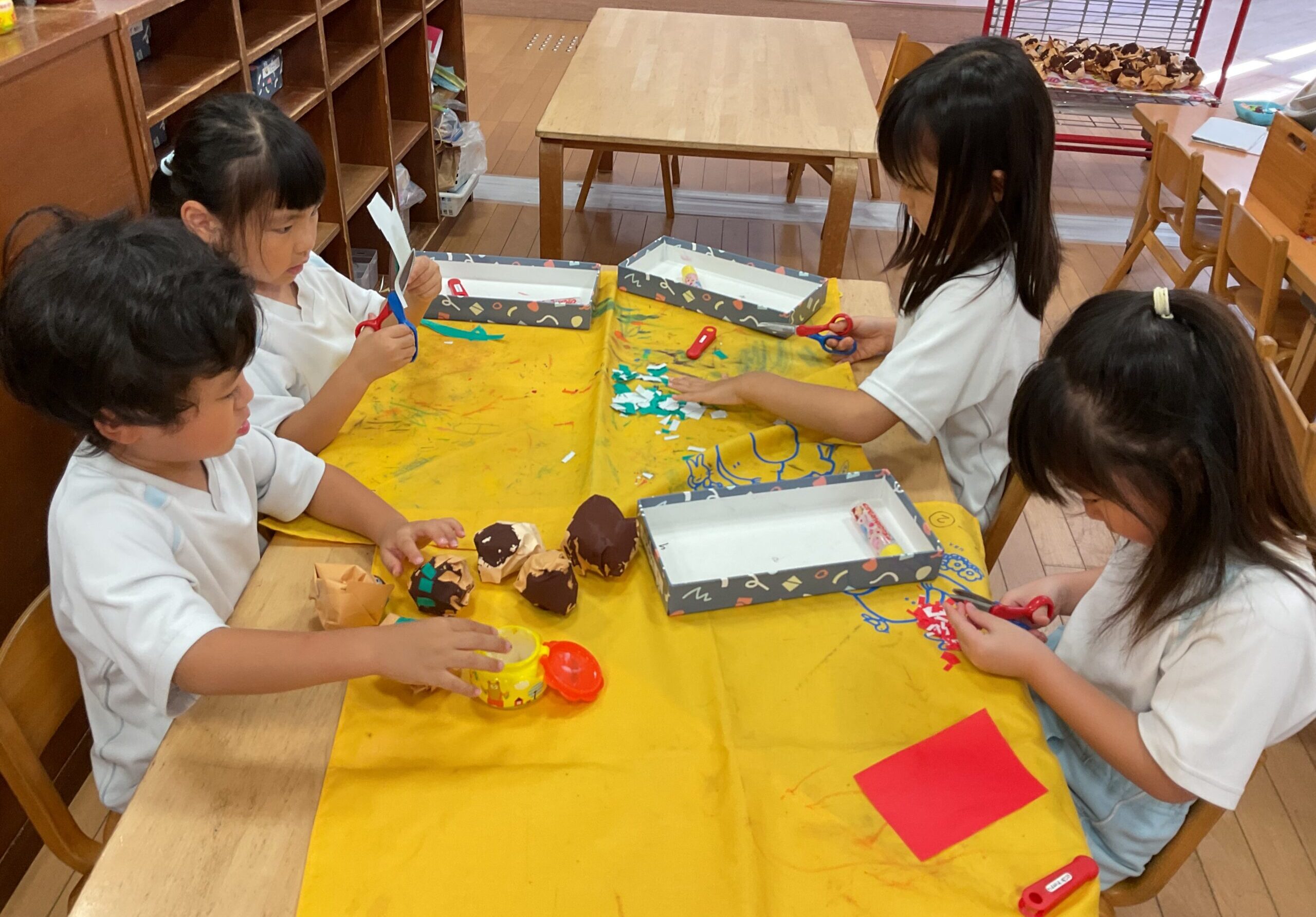 子どもたちとどんなお祭りにするか話し合ってみると、屋台やゲームコーナーを作りたいとの声が多く、テーマを「縁日」にすることにしました。