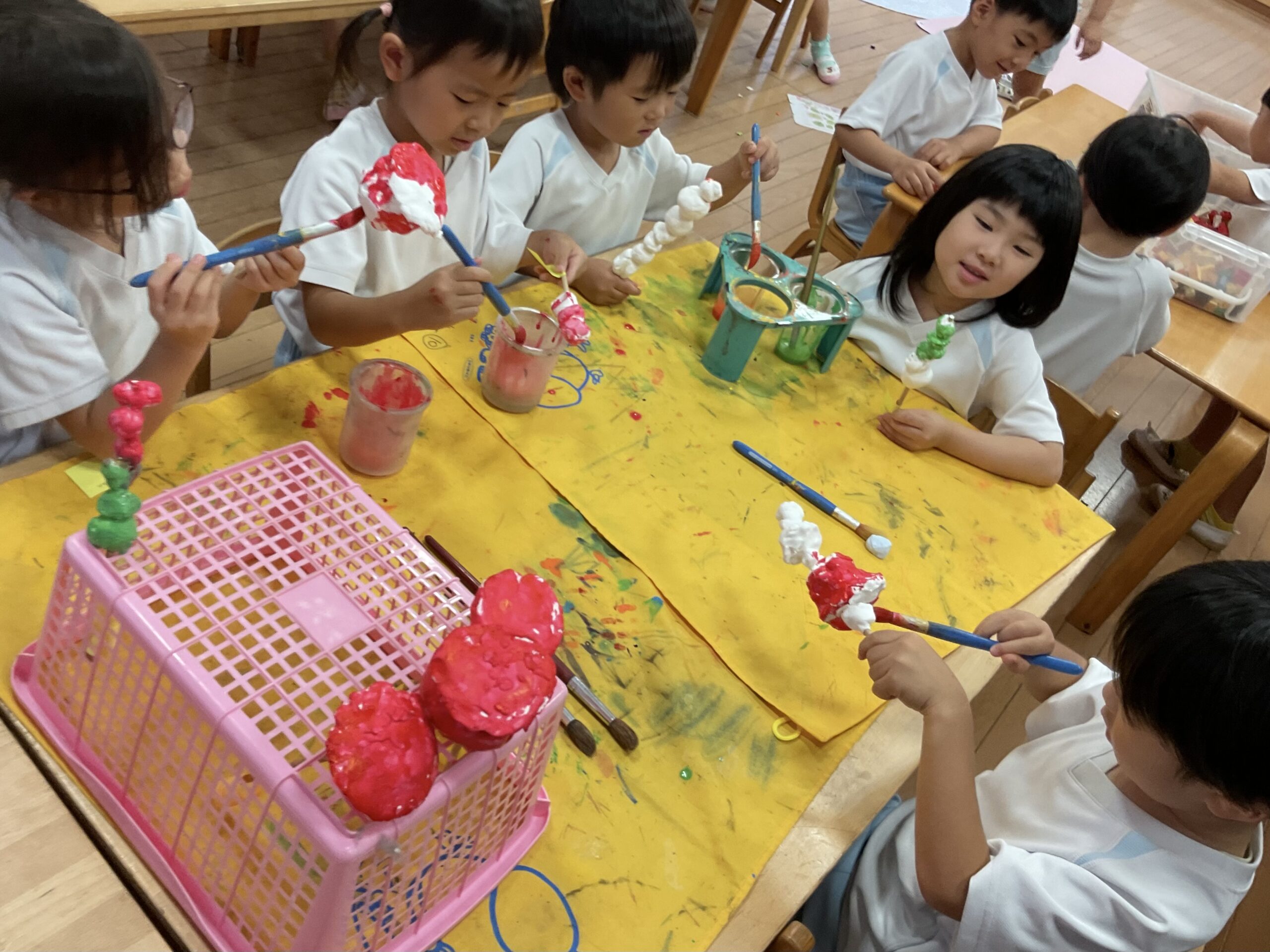 りんご飴は紙粘土を好きなフルーツの形にし、絵の具で色付けしました。