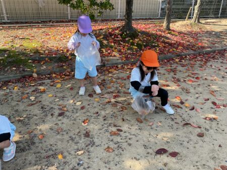 赤や黄色のたくさんのきれいな落ち葉やどんぐりに大喜び!他にはどんな“秋”があるかな?みんな夢中で探していました。