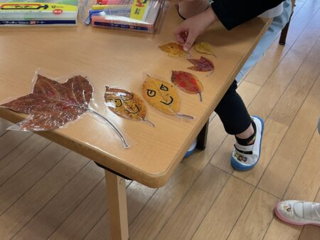 製作しながら「この葉っぱ私が拾ったやつ!」「どんぐりもいっぱいあったなー」「きのこは無かったな〜」など楽しかった秋見つけを振り返っていましたよ。