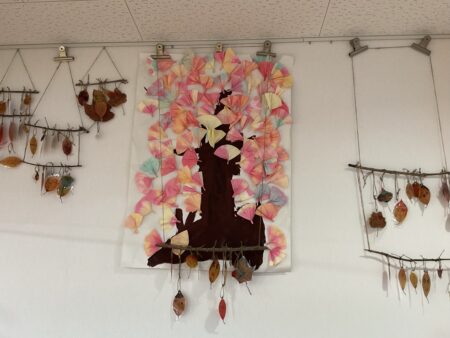 完成したモビールを飾ると保育園が一気に秋色に。