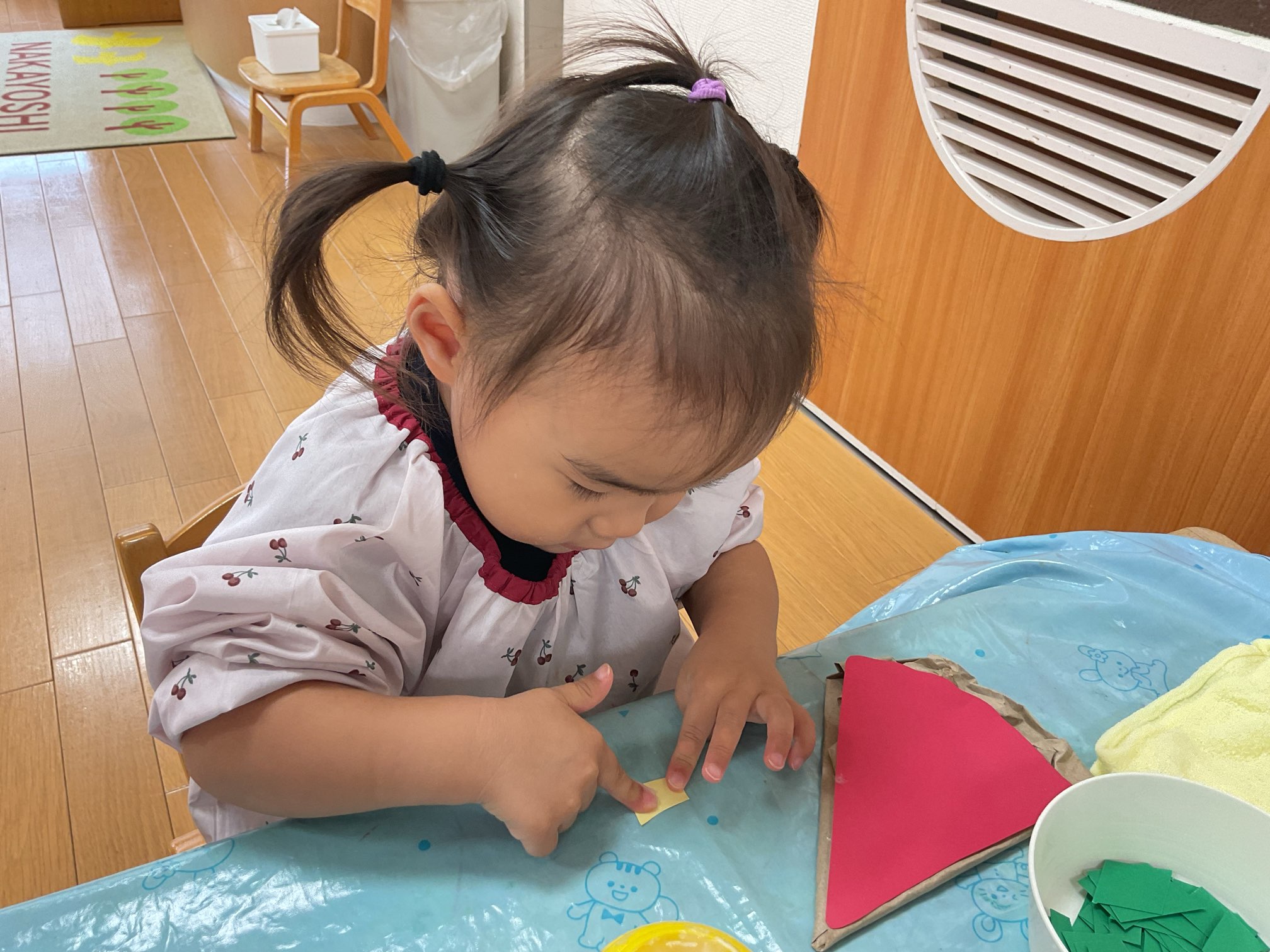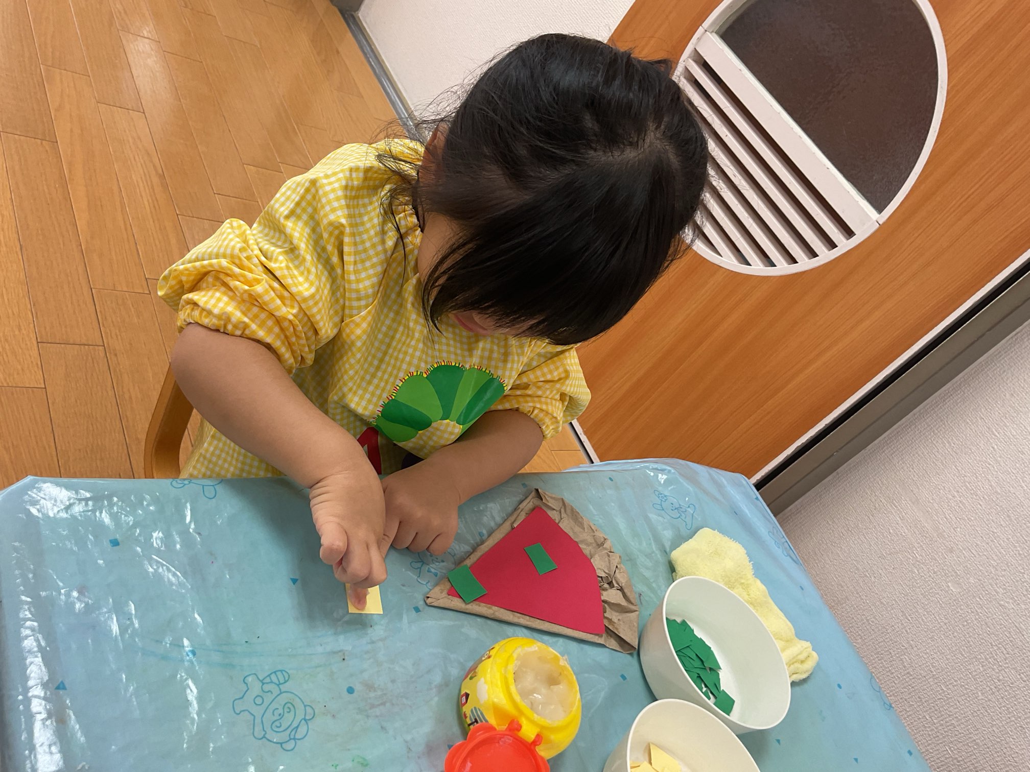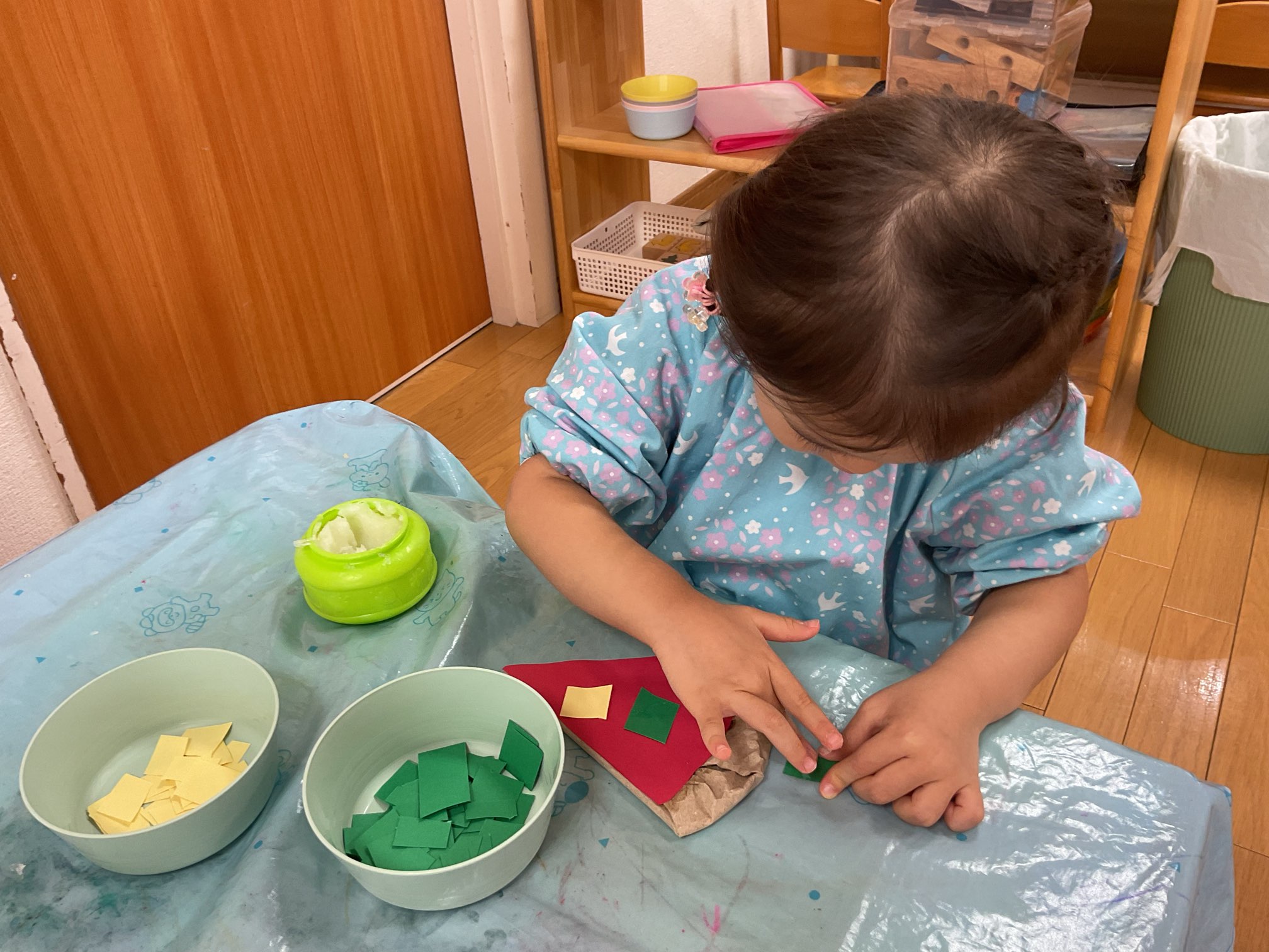 「このくらい?」と人さじ指でのりをとり、貼っていきます。