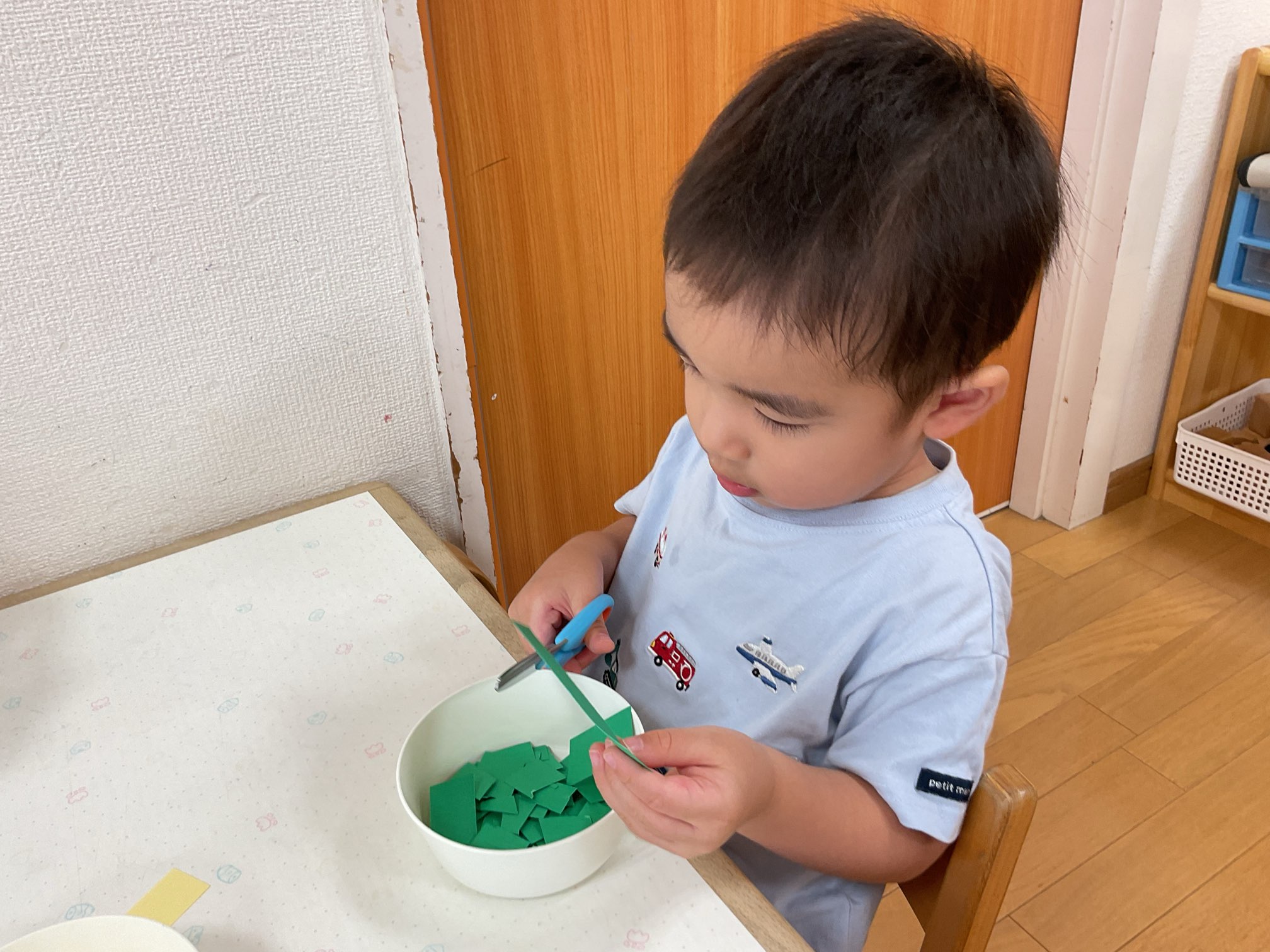 はさみを使って一回切りにチャレンジをしています。