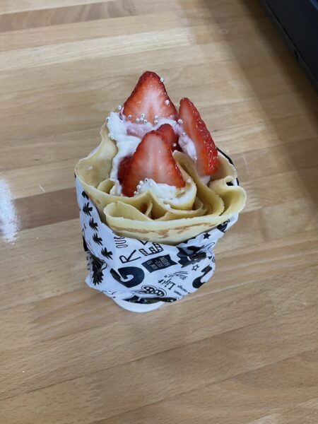 「生クリーム、イチゴ、チョコソース、カラースプレー!!!」と、好きな組み合わせを伝え・・・