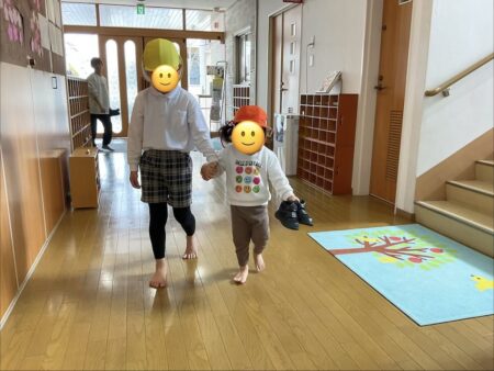 「おじゃましま〜す!」とお部屋に入り、園庭に出るため靴を取りに一緒に向かいます。