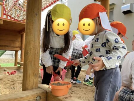 お砂場でアイスクリームを作ってあげたり、砂集めを手伝ってあげたり…