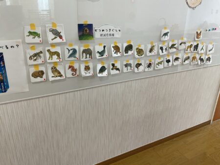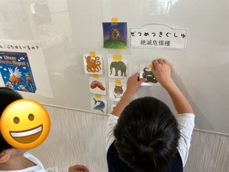 【絶滅危惧種】にスポットを当て、生き物探しをしました。「これは?」「この動物はいっぱいおる!」と友だちと相談しながらボードに貼っていきます。