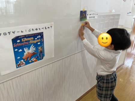 5歳児クラスでは、最近「ブタは飛べるの?」というアナログゲームが、子どもたちのお気に入りの遊びになっています。