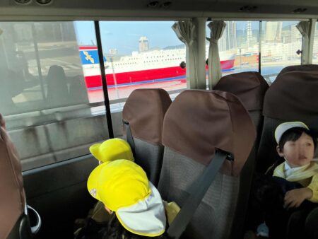バスの中では「僕のおにぎりシャケ!」「僕はおいなりさん!」とおにぎりトークをしたり、「あ、ポートタワーや!」「あの船めちゃくちゃ大きい」と外の景色を楽しんだりする姿もありました。