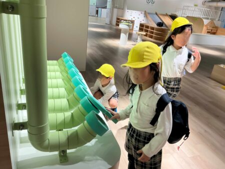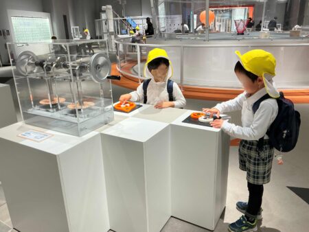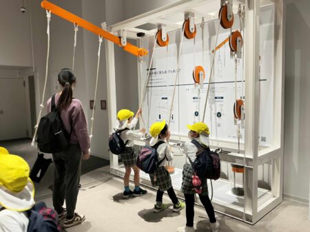『てこの原理』を知り、近い位置で引っ張ると重く、遠い位置だと軽く片手でも持てる!と不思議なことに気づき、『ドップラー効果』という、救急車の音が変化する原理でも、プロペラの速さが変わると音が変化することにも気づき、みんなおもしろそうに見ていました。