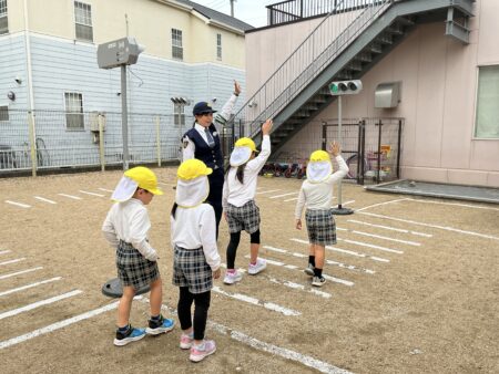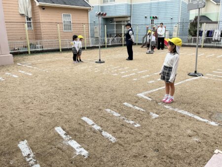 その後は、園庭で信号機を使って横断歩道を渡る練習をしました。