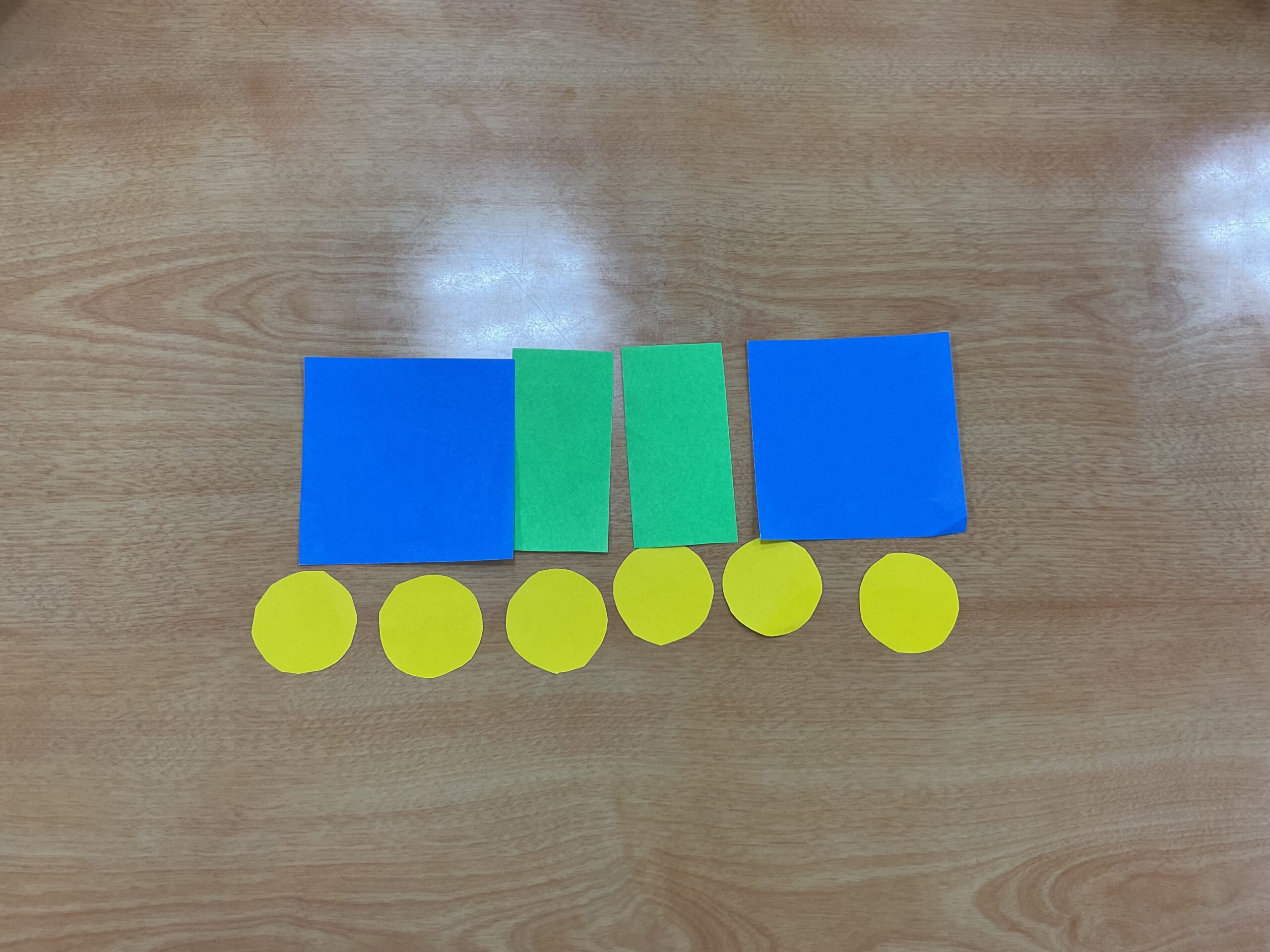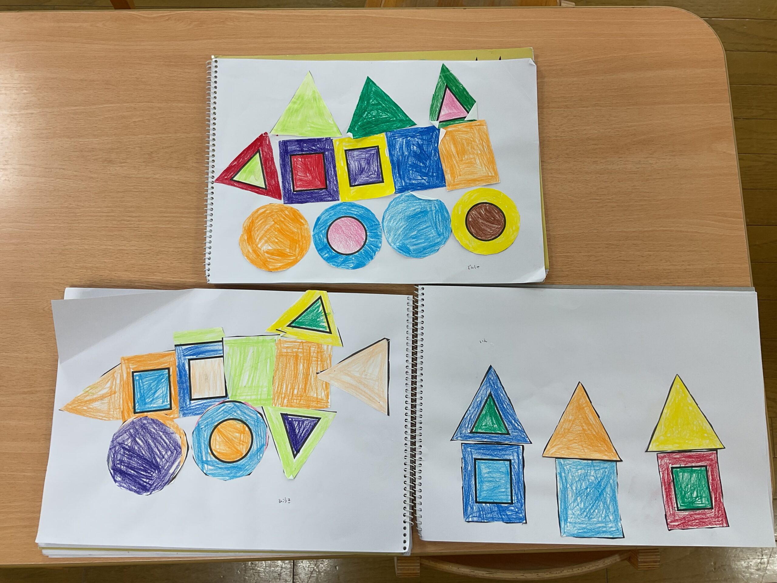 図形の塗り絵をし、ハサミで切ってパーツを作りました。
