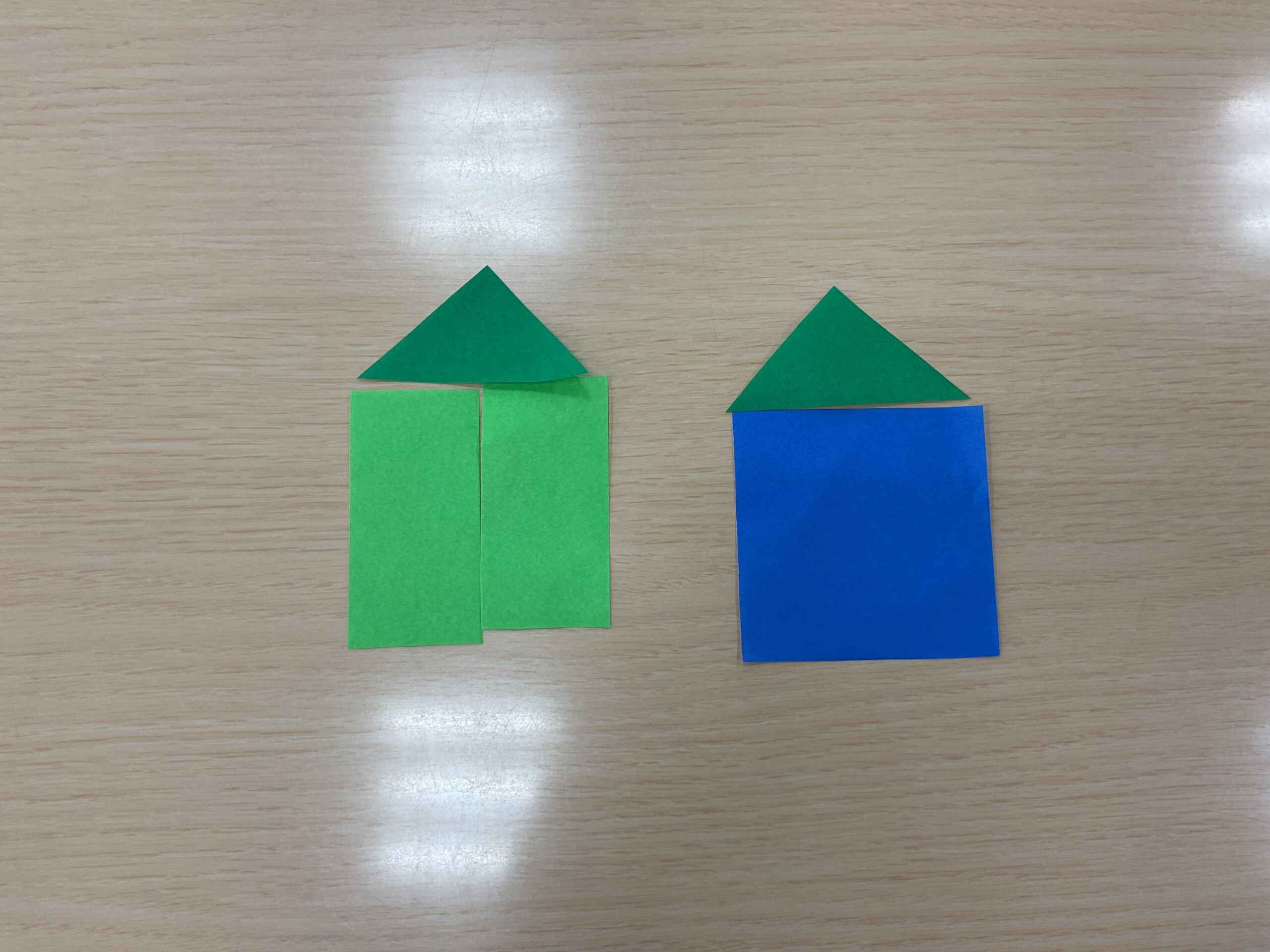 三角形や四角形、丸の形の図形を組み合わせて形を作ります。