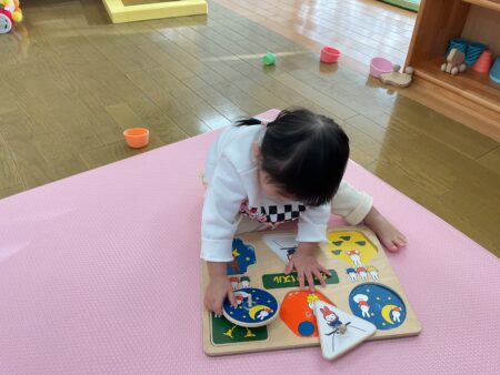 0歳児クラスで楽しむパズルは、ピースが少なく達成感が生まれます。