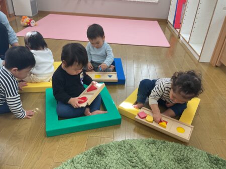 指先を使ったあそびとして、「ポットん落とし」で使う形をよく見ながら、遊ぶようになってきました。