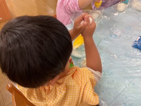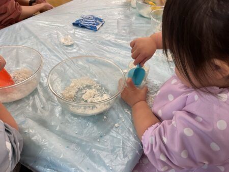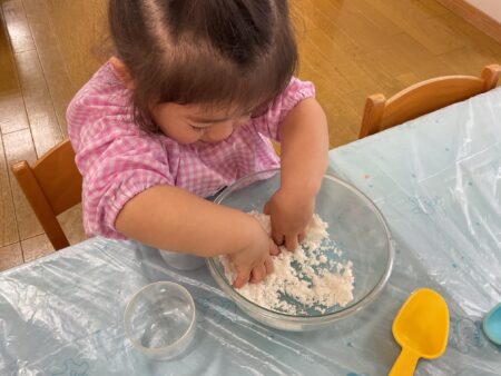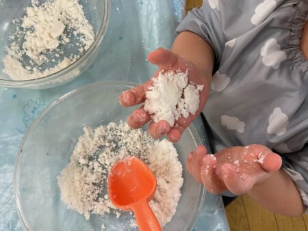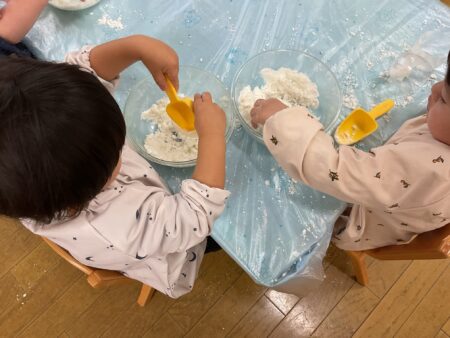 ブログ TOP > ブログ > 【りす組】魔法の雪遊び 【りす組】魔法の雪遊び 数年ぶりに神戸に雪が降りました。 「雪さわったよ」「冷たかった」とお話しをしていた為、お部屋でも雪遊びをしました。 重曹とヘアコンディショナーを混ぜ合わせると、溶けない魔法の雪の完成です。 遊ぶ前に冷蔵庫で冷やしていたので本物みたいに「つめたーい!」 両手でサラサラの雪を触ったり、握ってギュッギュッとなる感触を楽しんだり、、、 触るのが少し苦手なお友だちは、スコップですくう姿がありました。 春はそこまでやってきています。 あと少し、冬の遊びを楽しんでいきたいと思います。 2026.02.16