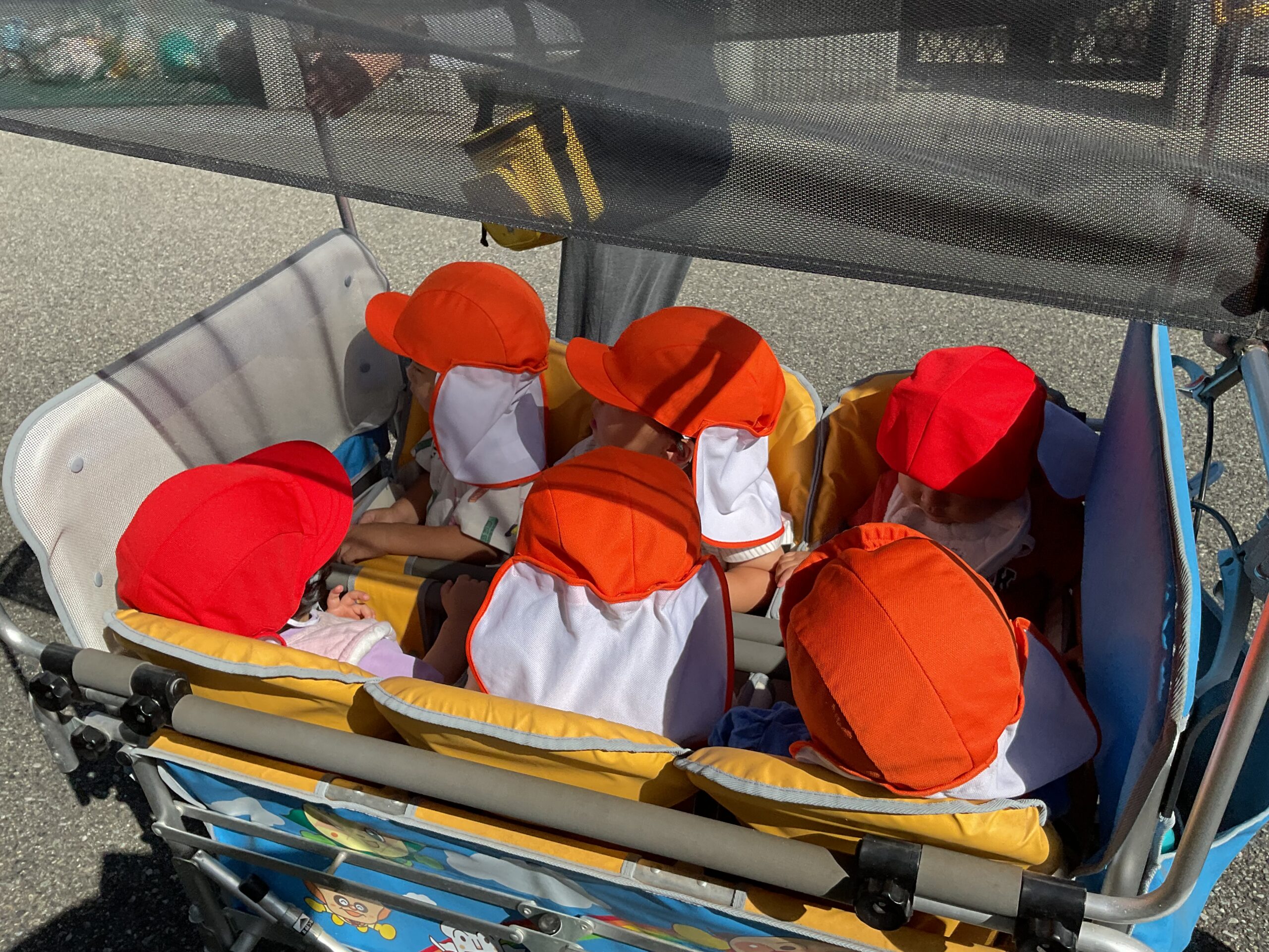 自分たちで靴下や靴を履いてバギーにに乗り込みます。