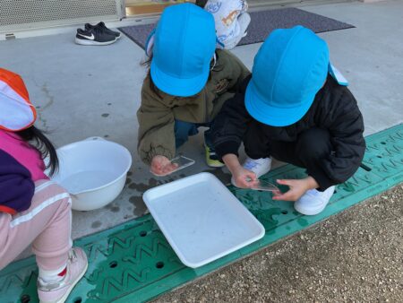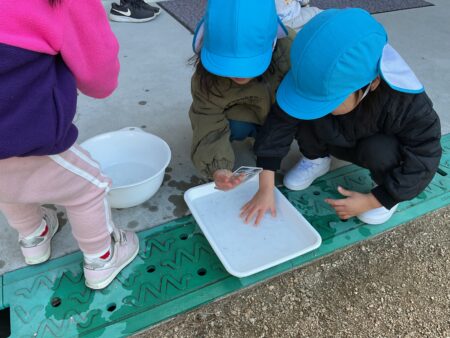 絵本の中で氷ができている様子を「ぼくたち(わたし)もこれであそびたい」という声から、水を入れた容器を園庭に置いてみました。
