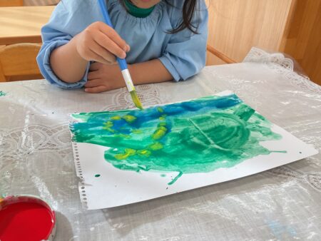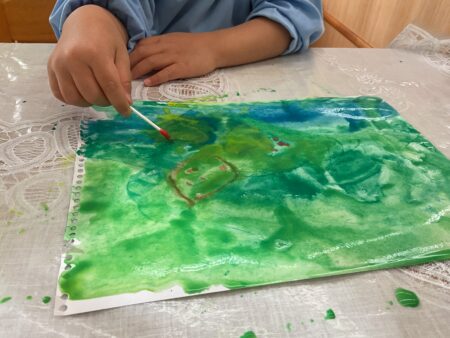 絵の具の上に違う色の絵の具をのせると絵の具がにじんできます。その不思議さに好奇心いっぱいの子どもたちから