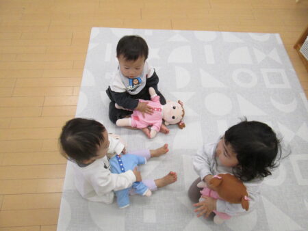 人形を抱っこして、「ゆりかごのうた」や「きらきらぼし」を歌いながら寝かしつけています。