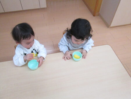 「いただきます」「おいしいね」等の覚えた言葉を交わしながら美味しそうにモグモグモグ。