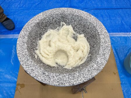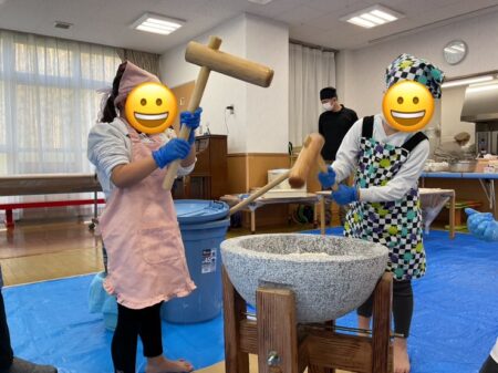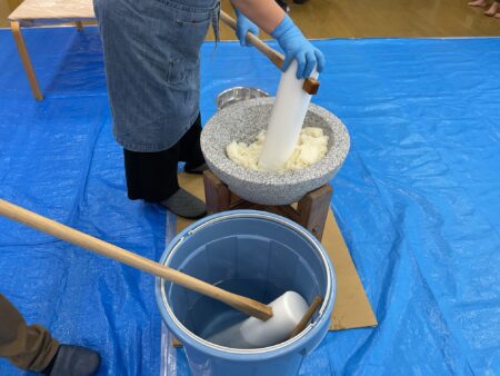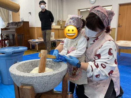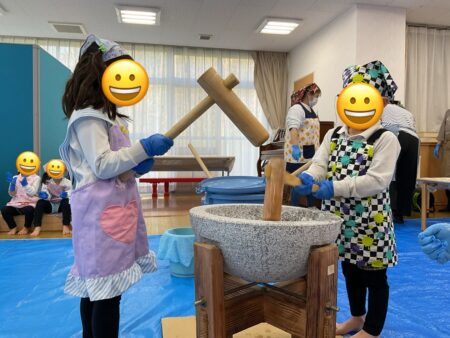 子ども用の杵で餅つきを体験します。周りの子どもたちの「ヨイショ!!」の掛け声に合わせてついていきます。3、4歳児は保育者と一緒に行ないました。