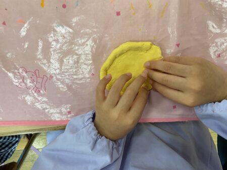 ボンドを混ぜて固めた白と黄色を合わせて作っていきました。