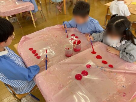 絵の具とボンドを混ぜてクリアファイルに丸を描いて作っていきます。