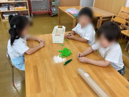モールを丸めて「ちょっとお花みたいな形にした方がピーマンに見える!」と工夫しながら作っていきます。