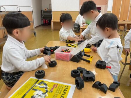 「構成あそびコーナー」では一緒におうちを作ったり、車を作り走らせたり・・・