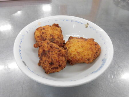 ④揚げ油170℃に温め、③をスプーンで丸め油に入れ、4、5分揚げて完成です。