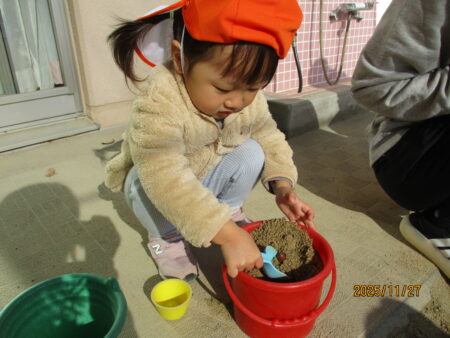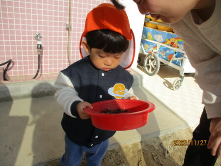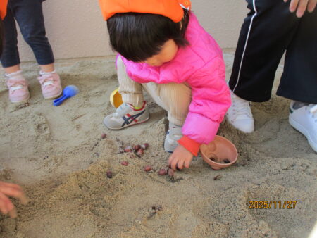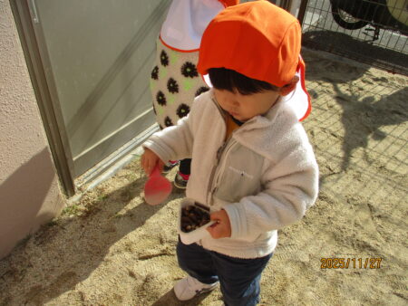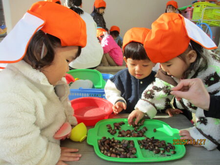 ブログ TOP > ブログ > どんぐりで遊んだよ♪(りすぐみ) どんぐりで遊んだよ♪(りすぐみ) どんぐりを広げると、子どもたちは大興奮! お気に入りの入れ物に集めたり保育者と一緒に宝探しをしたり、どんぐりご飯を作ってたくさん触れて遊んでいます。 どんぐりを器に入れて振ってみると…。 音が鳴ることが楽しくて何度も振って確かめています。 子どもたちの興味、関心に寄り添い、発見を見逃さず嬉しさや不思議さに共感していきたいです。 2025.11.29