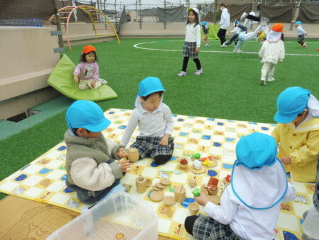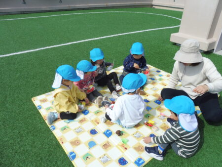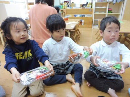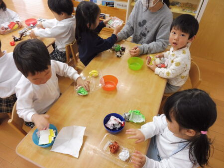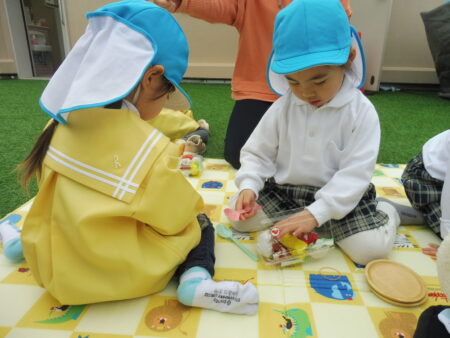 ブログ TOP > ブログ > ピクニックごっこ(うさぎぐみ) ピクニックごっこ(うさぎぐみ) 新聞紙や折り紙を丸めておにぎりやおかずを作っています。 卵焼きやからあげなど、お弁当に何を入れるかを考えながら作っています。 完成したお弁当を嬉しそうに見せてくれました。 園庭でピクニックごっこをしました。 スプーンで食べる真似をしたり、お友達に食べさせてあげたりして遊んでいます。 ままごとのお皿におかずをのせて、遊びを発展させて遊んでいます。 2026.03.27