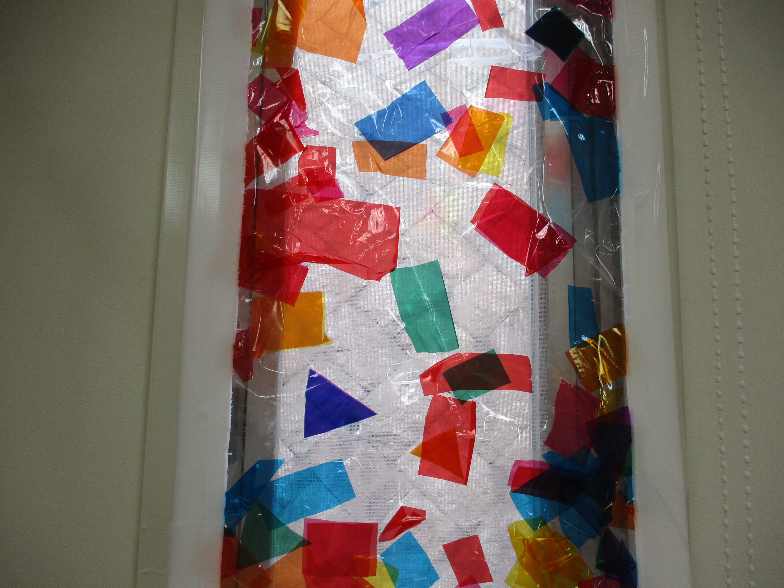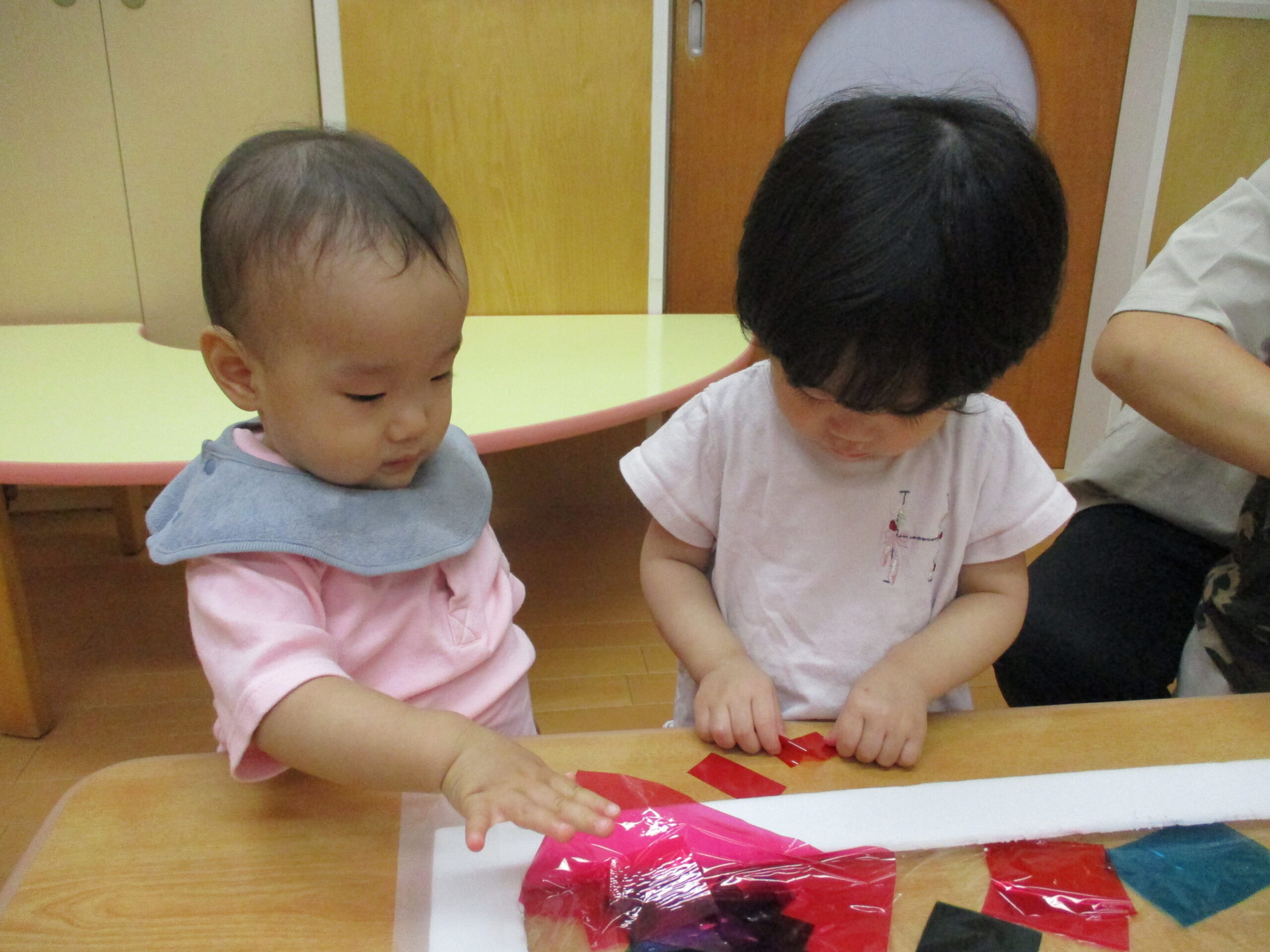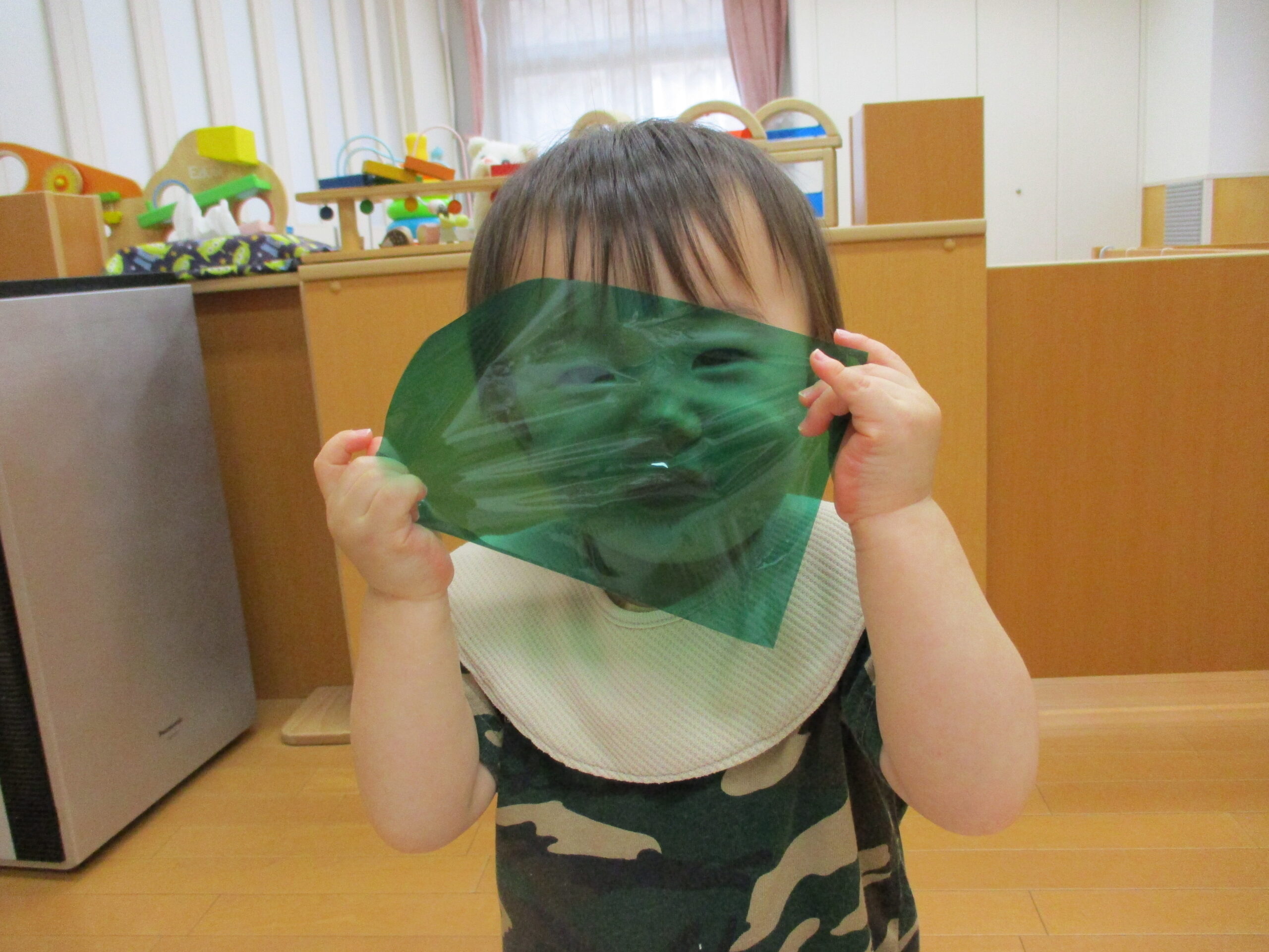 初めて見たセロファンに手をすくめるお友達もいましたが、ツルツルとした感触やセロファンを通して見える