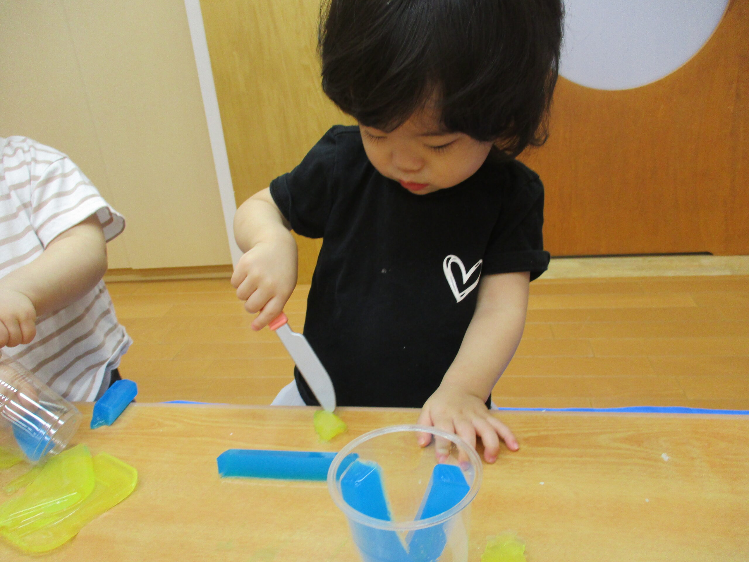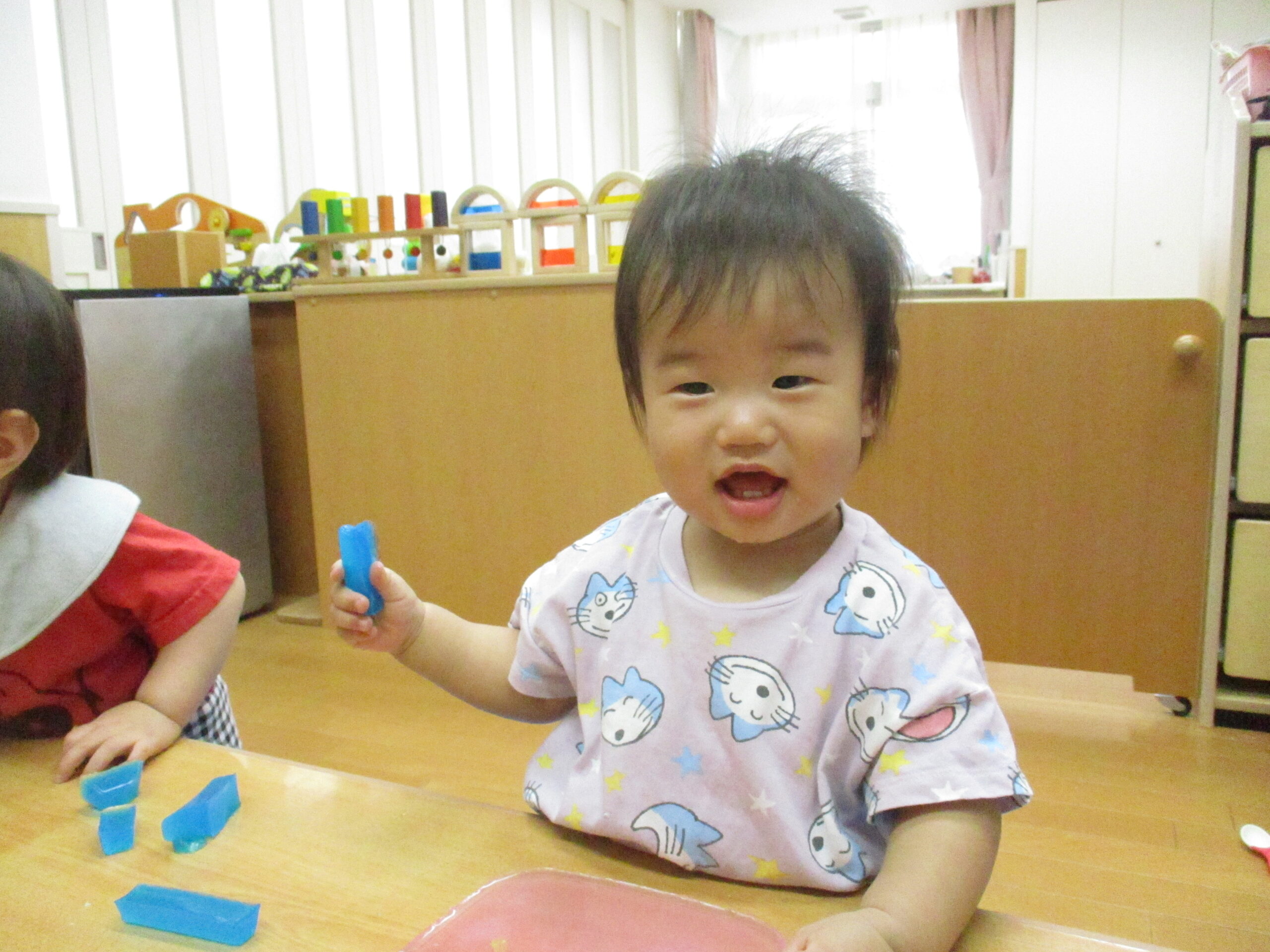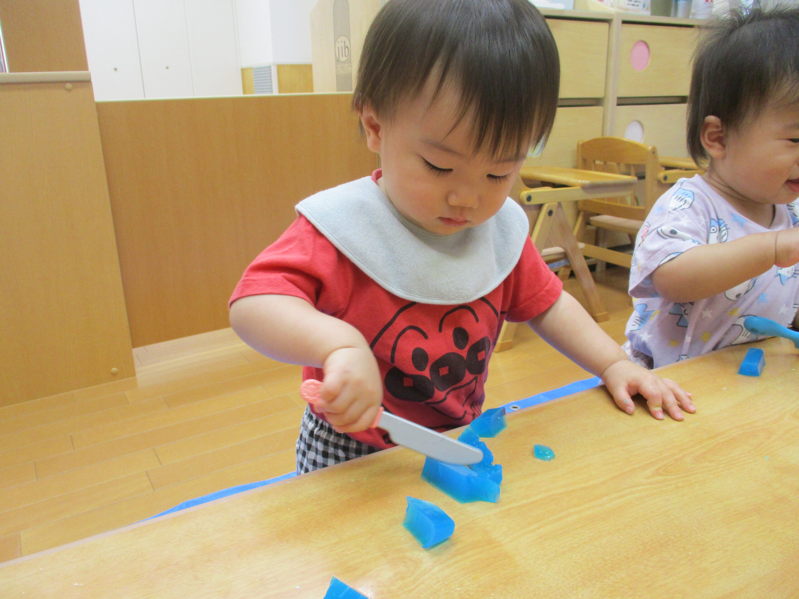 ぎゅ~と握ったり玩具の包丁で切ってみたり…。冷たい感触が心地良さそうです。