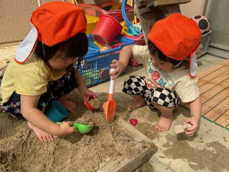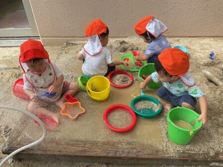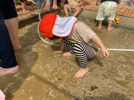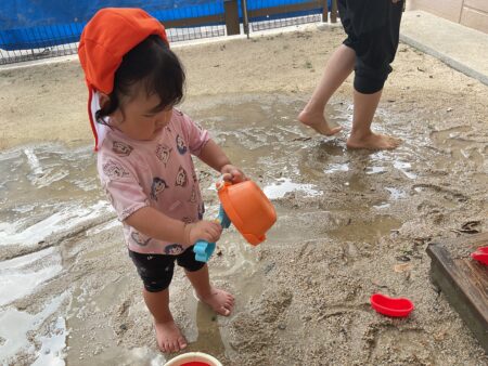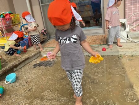 ブログ TOP > ブログ > 泥遊び(りすぐみ) 泥遊び(りすぐみ) 歩くたびに泥の感触に驚いていましたが、少しずつ両手で触ってみたり座って足をバタバタさせてみたりと 全身で楽しんでいます。 「はい、チョコレート」「〇〇ちゃんもチョコレートする」と友達同士のやりとりも見られてかわいいです。 砂場では、小さな穴を掘って池を作ったり道を作って川にしたりすることで、水の流れをじっと見つめたり 池の中に足を入れたりして遊んでいます。 いろいろな遊びを通して、子どもたちと一緒に驚きや楽しさに共感していきたいと思います。 2025.10.31